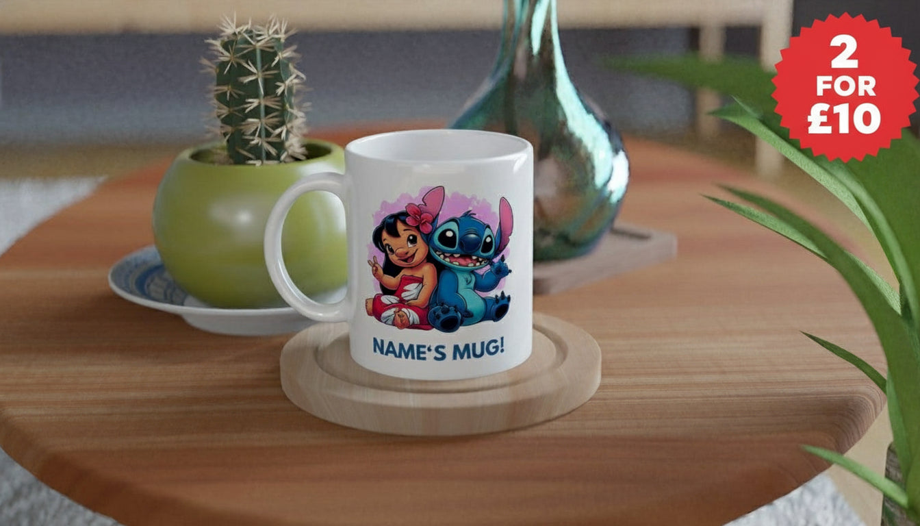 Celebrate the sweetest space duo with this personalised Stitch & Angel mug, customised with your name for that extra-touch of aloha. This 11oz ceramic mug captures the perfect mix of cute and chaos β a must-have for any Disney fan who believes love (and coffee) conquers all.